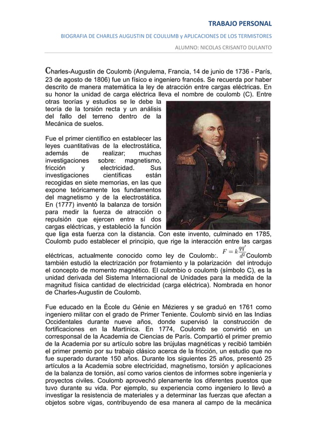 BIOGRAFIA DE Charles Agustin de Coulomb PDF Ingenieria Eléctrica
