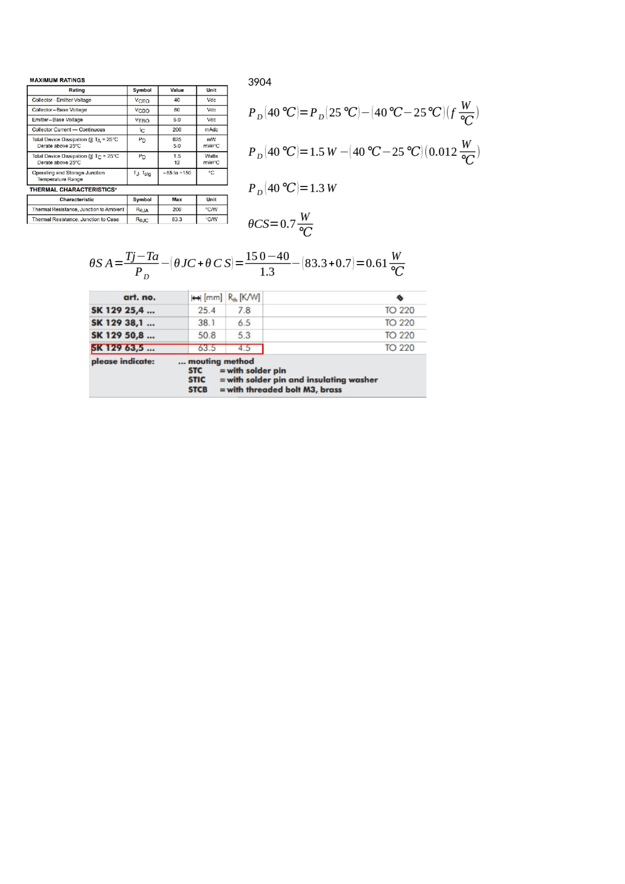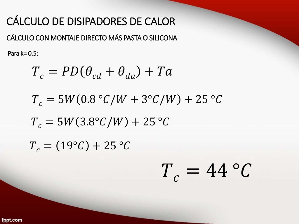 R = resistencia. T = temperatura. P = potencia. La fórmula anterior se parece mucho a una fórmula por todos conocida (La ley de Ohm). R = V / I. Donde se reemplaza V por T a I por P y R queda igual. Ejemplo: Se utiliza un Triac FKPF8N80 que produce 5 Watts en su "juntura". Con los datos del Triac FKPF8N80, este puede aguantar hasta 200 Watts.