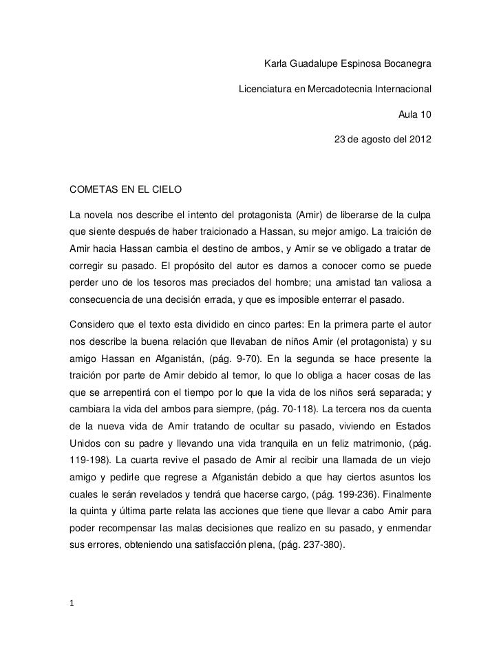 Contactar. "Cometas en el cielo" escrita por Khaled Hosseini, publicada en el año 2003, constituye el primer libro escrito por este autor. Se redactó durante los acontecimientos trágicos del once de septiembre en Estados Unidos. Nos revela una historia de padre e hijo, resaltando el ámbito familiar y su importancia. Índice.