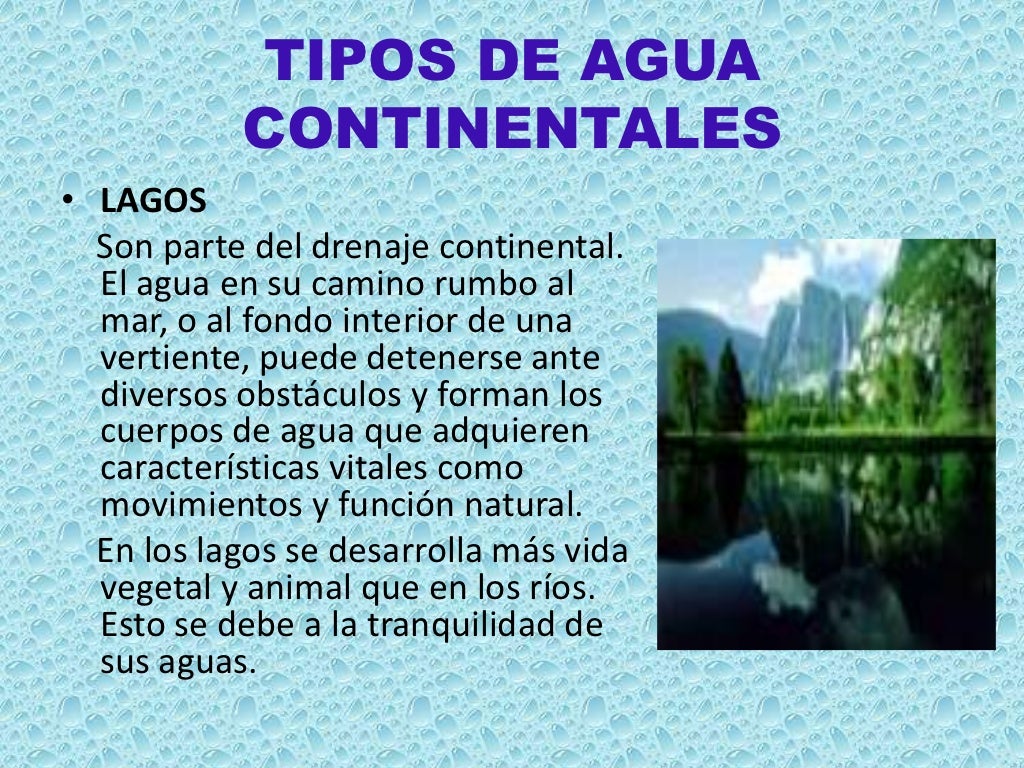 Las aguas continentales se refieren a cuerpos de agua dulce que se encuentran en la superficie terrestre, como ríos, lagos, lagunas, humedales y acuíferos. Sus características incluyen la falta de salinidad, su origen principalmente a partir de precipitac iones y su importancia como fuentes de agua dulce para diversas actividades humanas y.