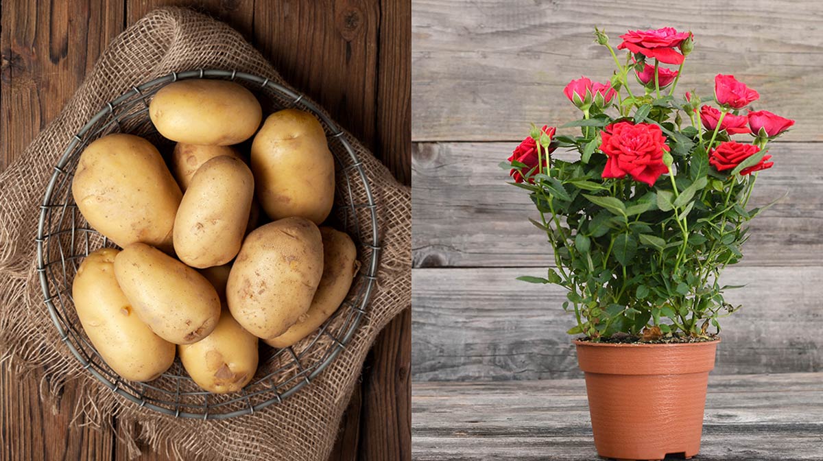 Esqueje de rosa en una papa mantiene las flores vivas por más tiempo