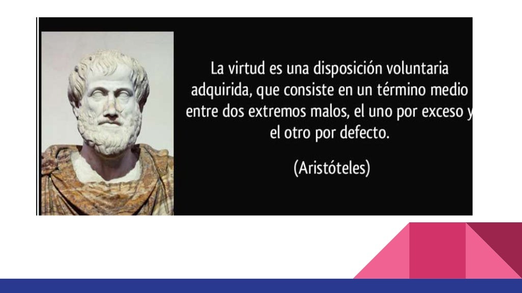 Aristóteles distingue dos tipos de virtudes: 1. La virtud ética o moral. Son adquiridas a través del hábito y la costumbre y se encarga de dominar la parte sensitiva o irracional del alma y de regular las relaciones entre los individuos. Para Aristóteles, la virtud moral es el justo medio entre dos extremos.