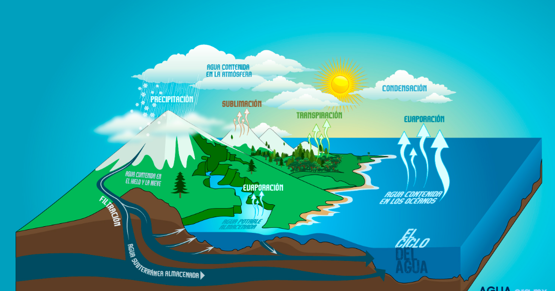 El agua sufre una serie de transformaciones y desplazamientos en los que va pasando por sus tres estados: líquido, sólido y gaseoso. Este ciclo se compone de varias etapas, que se desarrollan de forma sucesiva y simultánea, y se repiten y compenetran con otras: Evaporación. El sol calienta los océanos y del resto de superficies acuáticas.