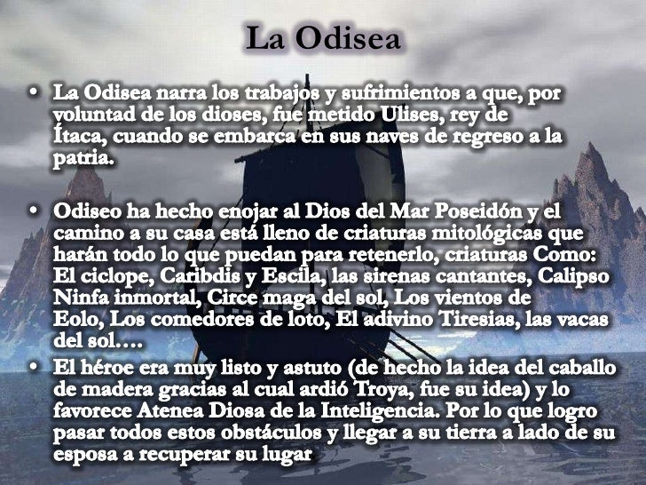 Resumen y sinopsis de La Odisea de Homero. Tras una década de guerra, una ofensa al dios Poseidón ha alejado de su reino al astuto héroe otros diez años, condenado a navegar sin rumbo y a sufrir las más diversas vicisitudes. La Odisea, que sucede a la caída de Troya, sigue los pasos de Ulises -el nombre latino de Odiseo, que esta.