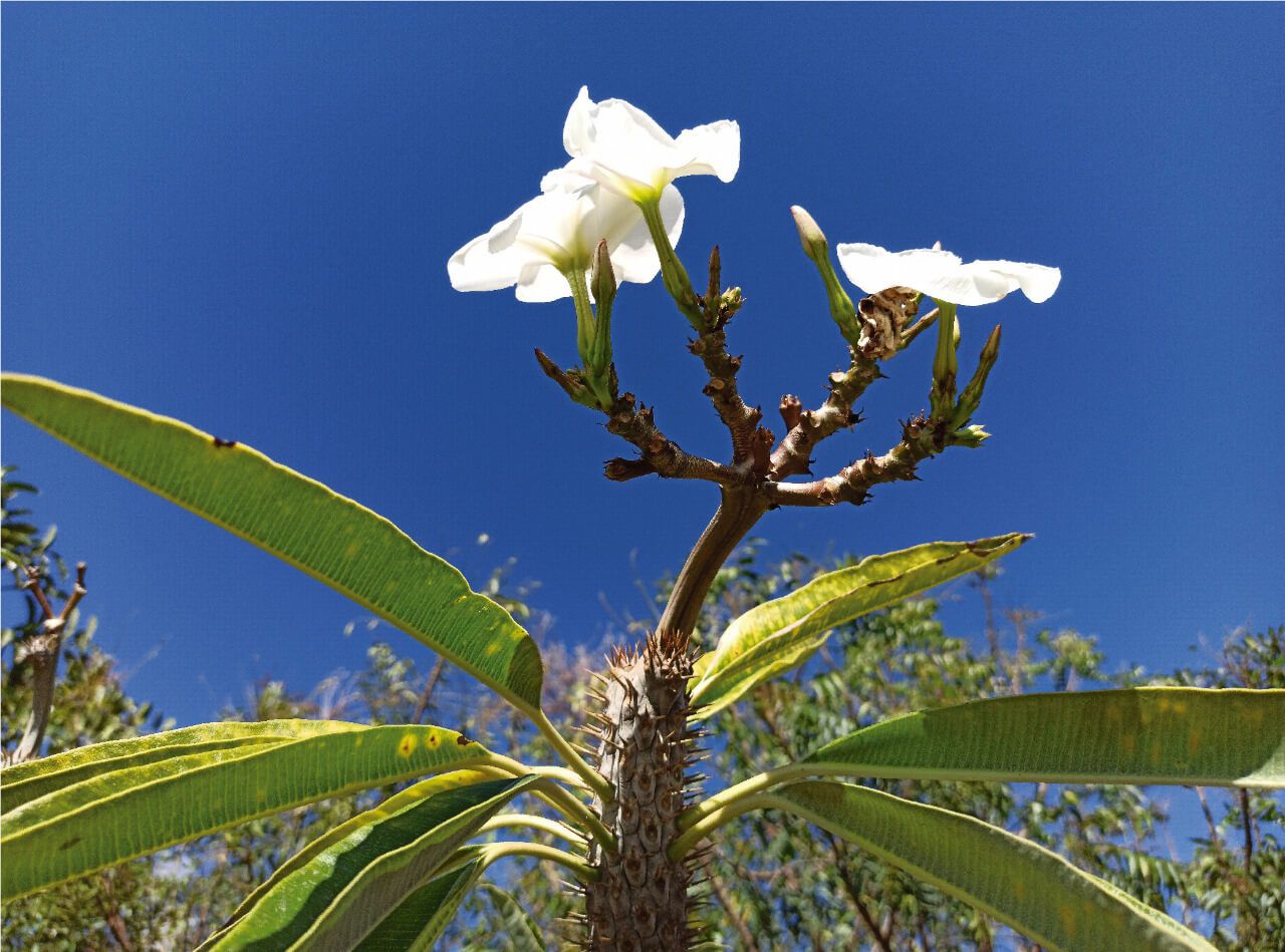 Un ejemplar adulto de palmera de Madagascar ( Pachuypodium lamerei) llega a alcanzar más de 8 metros de altura, con un tronco grueso y espinoso que, en especies adultas, supera los 80 centímetros de diámetro. Otra característica destacable de la palmera de Madagascar es su floración, produciendo flores de gran tamaño (8-10 cm de diámetro.