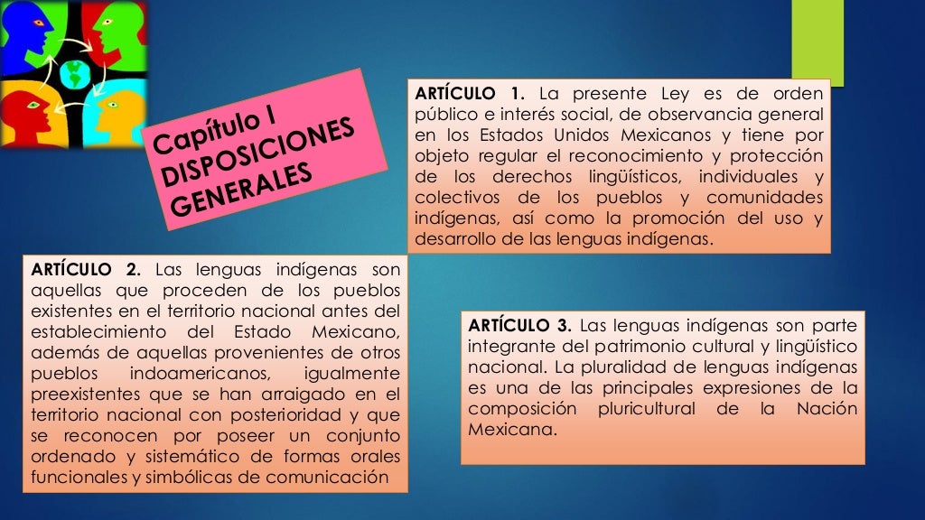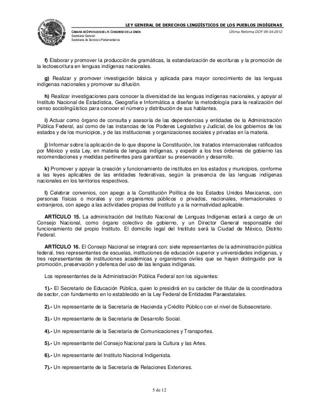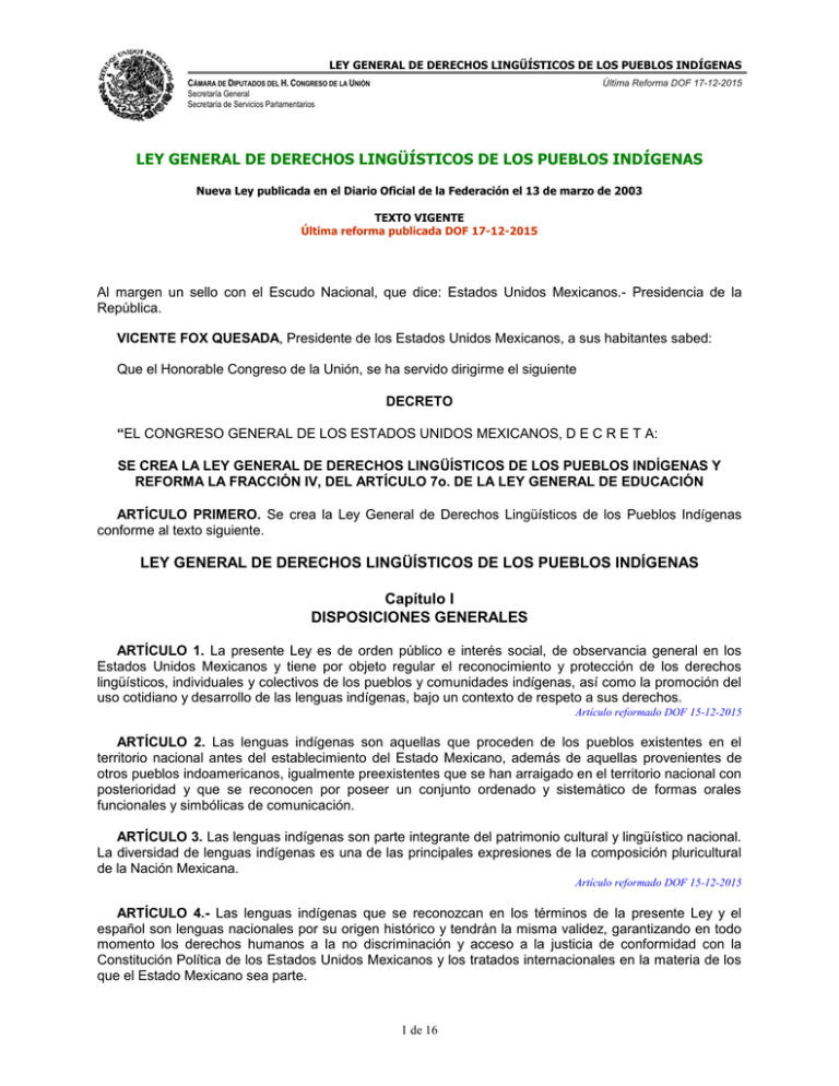 Página 1 de 16 LEY GENERAL DE DERECHOS LINGÜÍSTICOS DE LOS PUEBLOS INDÍGENAS Al margen un sello con el Escudo Nacional, que dice: Estados Unidos Mexicanos.- Presidencia de la República. VICENTE FOX QUESADA, Presidente de los Estados Unidos Mexicanos, a sus habitantes sabed: Que el Honorable Congreso de la Unión, se ha servido dirigirme el.