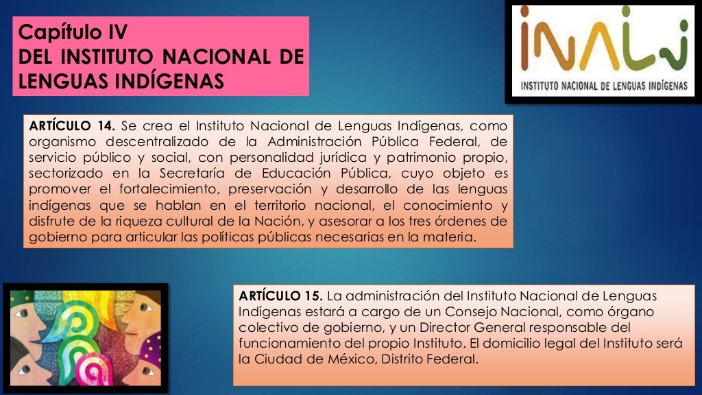 en 2003 de la Ley General de Derechos Lingüísticos de los Pueblos Indígenas (LGDLPI) en el Diario Oficial de la Federa-ción. En ésta se mandata la creación del Instituto Nacional de Lenguas Indígenas (INALI), que tiene entre sus objetivos promover el fortalecimiento, la preservación y el desarro-