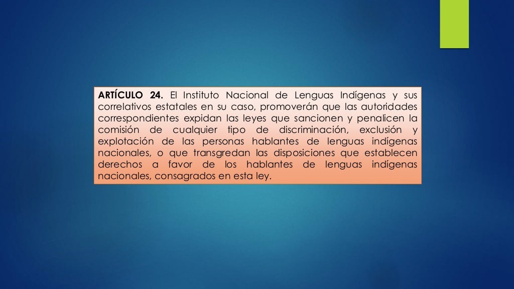 Ley General de Derechos Lingüísticos de los Pueblos Indígenas (English: General Law of Indigenous Peoples' Linguistic Rights) was published in the Mexican Official Journal of the Federation on 13 March 2003 during the term of Mexican President Vicente Fox Quesada.It gave rise to the creation of the National Institute of Indigenous Languages.. This law is a juridical element that specifies.