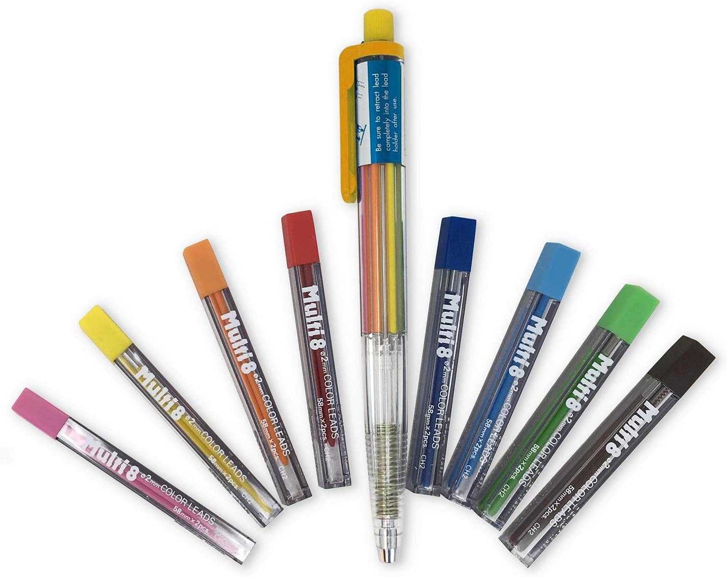 Portaminas con minas de 8 colores para diseñadores, estudiantes y publico en general. Estas minas son de colores brillantes con minas de color rojo, azul, verde claro, marrón, anaranjado, rosa, azul cielo y amarillo. Utiliza mina CH de 2,0 mm Perfecto para resaltar en papeles y destacar textos o documentos tales como enciclopedias, biblias, diccionarios, ideal para dibujo, arte, etc.