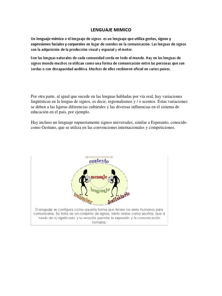 El lenguaje mímico es una forma de comunicación y/o expresión no verbal que utiliza gestos y movimientos corporales. De esta manera, el lenguaje mímico expresa una idea o mensaje por medio de gesticulaciones y movimientos del cuerpo. Por lo general, el lenguaje mímico se emplea para transmitir todo tipo de emociones, necesidades o.