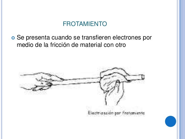 Electrización de materiales. Existen tres formas de electrizar un cuerpo: electrización por fricción,' conducción' e inducción.En estos procedimientos siempre está presente el principio de conservación de la carga y la regla fundamental de la electrostática.. Fricción. Al frotar dos cuerpos eléctricamente neutros (número de electrones igual al número de protones), ambos se cargan.
