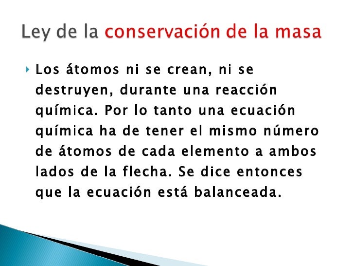 De acuerdo a la ley de la conservación de la materia, la masa de AB2 debe ser igual a la sumatoria de las masas de A y B2, respectivamente. Entonces, si 37 g de A reaccionan con 13 g de B2, el producto AB2 debe pesar 50 g. Por lo tanto, en una ecuación química, la masa de los reactivos (A y B2) debe ser siempre igual a la masa de los.